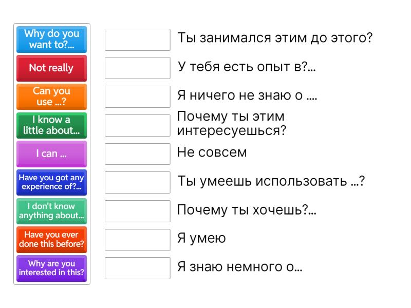 Why do you want to?... - Почему ты хочешь?..., Why are you interested in this? - Почему ты этим интересуешься?, Have you ever done this before? - Ты занимался этим до этого?, Have you got any experience of?... - У тебя есть опыт в?..., Can you use ...? - Ты умеешь использовать ...?, I can ... - Я умею , I know a little about... - Я знаю немного о..., I don't know anything about... - Я ничего не знаю о ...., Not really - Не совсем,