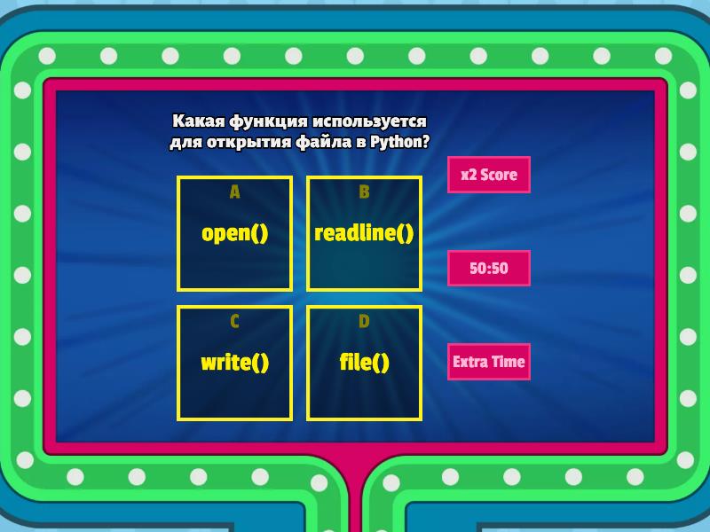 1) Какая функция используется для открытия файла в Python? a) open() b) readline() c) write() d) file() 2) Какая функция используется для считывания строки из файла? a) readline() b) write() c) close() d) file() 3) Какая функция используется для закрытия файла? a) readline() b) write() c) close() d) file() 4) Логическое умножение a) конъюнкция b) дизъюнкция 5) Логическое сложение a) конъюнкция b) дизъюнкция 6) Какое из перечисленных логических выражений является составным? a) вложенные b) дизъюнкция,конъюнкция 7) Какое значение принимает выражение 5 > 0? a) true b) false 8) x==0 a) Число x не равно нулю b) Число x равно нулю 9) != какой это знак ,в языке программирования? a) равно b) неравно 10) Как переводится if в языке программирования? a) если b) то