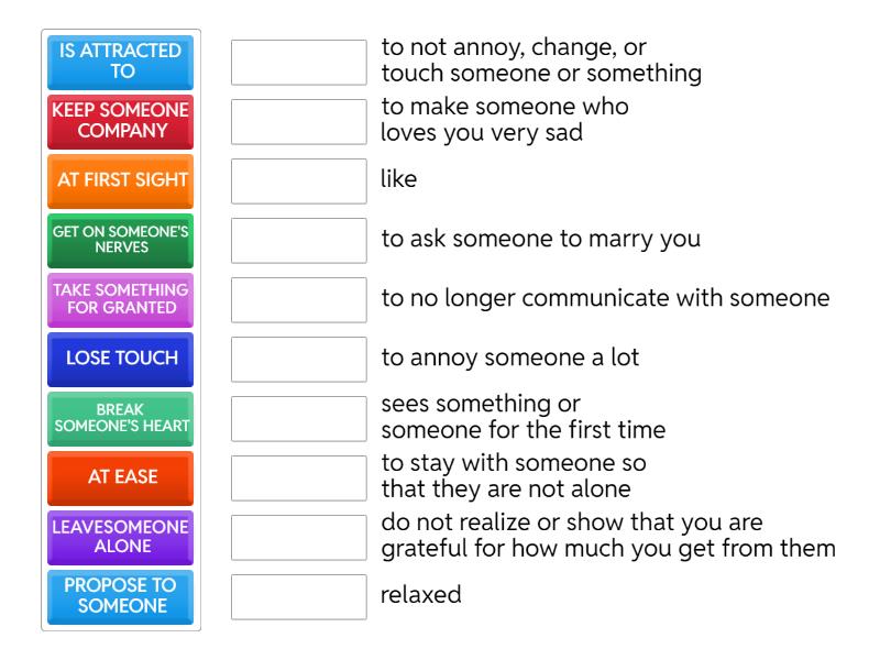 AT EASE​ - relaxed, GET ON SOMEONE'S NERVES​ - to annoy someone a lot, LOSE TOUCH​ - to no longer communicate with someone, AT FIRST SIGHT​ - sees something or someone for the first time, BREAK SOMEONE'S HEART​ - to make someone who loves you very sad, TAKE SOMETHING FOR GRANTED​ - do not realize or show that you are grateful for how much you get from them, IS ATTRACTED TO​ - like, PROPOSE TO SOMEONE​ - to ask someone to marry you, LEAVESOMEONE ALONE​ - to not annoy, change, or touch someone or something, KEEP SOMEONE COMPANY​ - to stay with someone so that they are not alone,