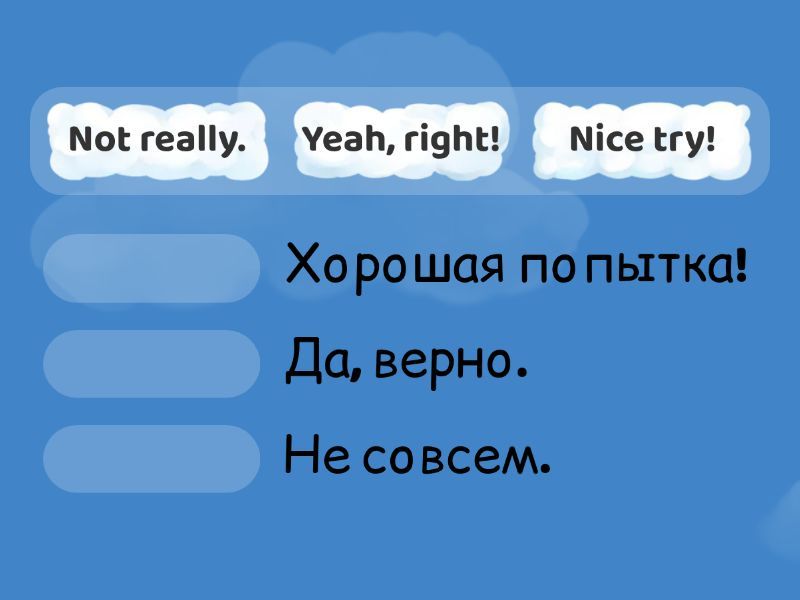 Not really. - Не совсем., Nice try! - Хорошая попытка!, Yeah, right! - Да, верно.,