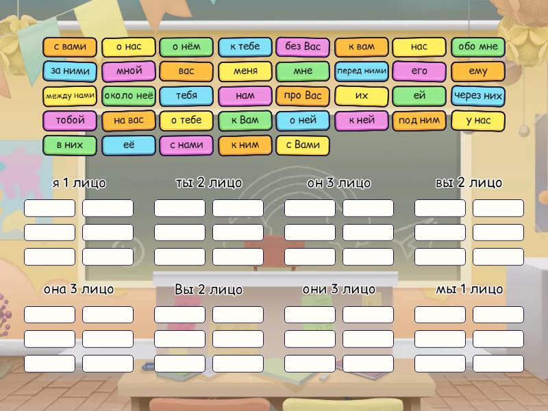 я 1 лицо: меня, мной, мне, обо мне, ты 2 лицо: тебя, тобой, к тебе, о тебе, он 3 лицо: его, ему, под ним, о нём, вы 2 лицо: с вами, вас, на вас, к вам, она 3 лицо: её , ей, около неё, к ней, о ней, Вы 2 лицо: с Вами, про Вас, к Вам, без Вас, они 3 лицо: к ним, за ними, перед ними, через них, в них, их, мы 1 лицо: нас, с нами, о нас, нам, у нас, между нами,