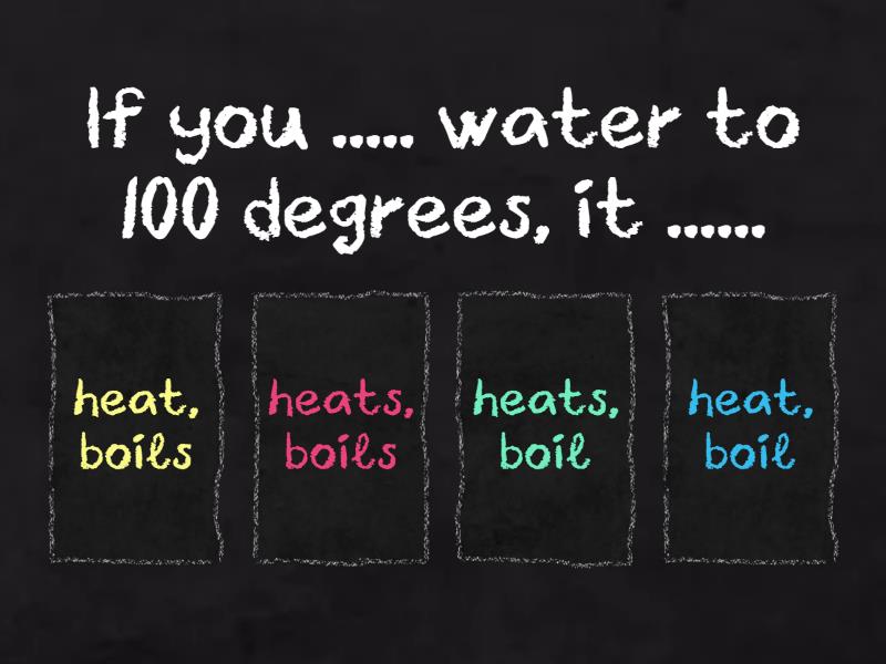 1) If you ..... water to 100 degrees, it ...... a) heat, boils b) heats, boils c) heats, boil d) heat, boil 2) When you ..... , you ..... hungry. a) don't eat, got b) doesn't eat, gets c) don't eat, get d) didn't eat, got 3) If you want to ..... a message, ..... after the beep. a) leave, speaks b) left, spoke c) leave, speak d) leaves, speaks 4) If I ..... sugar in my tea even for a week, I always ..... weight. a) didn't put, lost b) doesn't put, loses c) don't put, lost d) don't put, lose 5) She always ..... when she ..... what she wants. a) cried, didn't get b) cry, don't get c) cries, doesn't get d) cried, hadn't gotten 6) When I ..... less alcohol, I always ..... better. a) drank, felt b) drink, feel c) drinks, feels d) drink, felt 7) My boss never ..... when I ..... late for work. a) complains, am b) complained, were c) complained, was d) complains, was 8) If you ............ a piece of paper, it ....... to the ground. a) drop, falls b) drops, fall c) dropped, fell d) drop, fall 9) If you .............. the switch, the light ........... a) turns off, go off b) turn off, goes off c) turns off, goes off d) turned off, go off 10) If you .......... the ball, it ........... a) pushes, move b) push, move c) push, moves d) pushes, moves