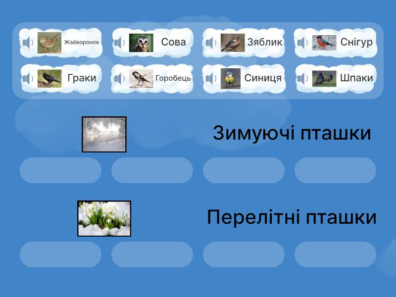 Зимуючі пташки : Синиця, Горобець, Снігур, Сова, Перелітні пташки : Жайворонок, Шпаки , Граки , Зяблик ,