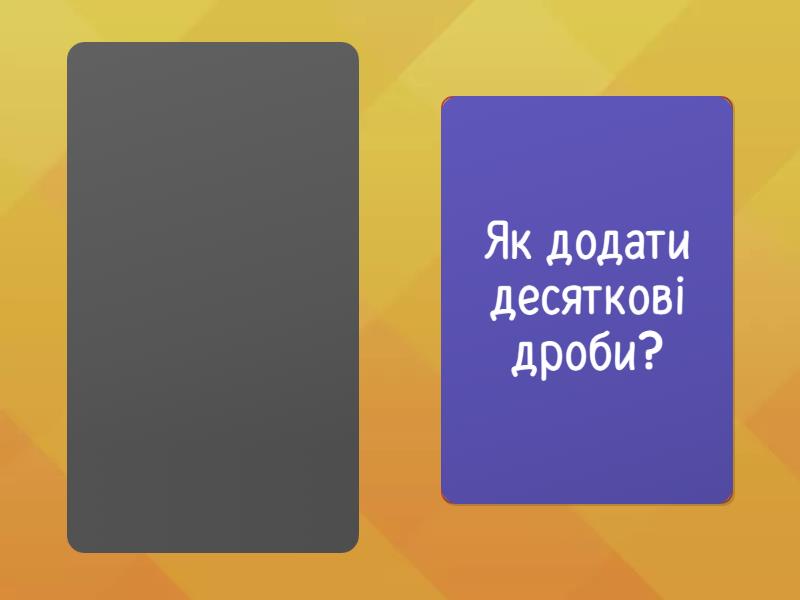 Який запис десяткового дробу?, 35,672 * 0,001, Як перетворити звичайний дріб на десятковий?, 44,8 : 2, Як порівняти десяткові дроби?, 30,672 * 10, Як відняти десяткові дроби?, 6,127 : 10, Як додати десяткові дроби?, 1,5 * 2, Як помножити десяткові дроби?, 7,045 : 0,01, Які окремі випадки множення десяткових дробів ти знаєш?, 5,01 * 3, Як поділити десятковий дріб на натуральне число?, 35,677 * 0,1, Як поділити десятковий дріб на десятковий дріб?, 50 : 0,5, Які окремі випадки ділення десяткових дробів ти знаєш?, 18,3 : 0,3.