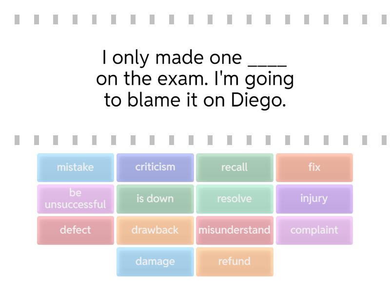 mistake - I only made one ____ on the exam. I'm going to blame it on Diego. , misunderstand - It’s easy to _____ someone’s tone in a text message., refund - She requested a partial ___ after realizing she had been charged twice even though she only bought one product , recall - When the ___ was announced, customers were instructed to return their products to the closest Apple store., complaint - She filed a ____ with customer service after receiving a damaged item. She hoped she would at least get a refund, criticism  - She didn’t take his _____ personally, knowing it was meant to help her grow., resolve - The manager helped ____ the issue between the two employees by facilitating a meeting., fix  - We hired a technician to _____ the broken air conditioner , injury  - The boy suffered an _____ after the faulty phone exploded in his pocket , damage  - The protesters caused _____ to private property. , defect - The car was returned to the dealership because it had a serious _____ in the engine., drawback  - One major _____ of living in the city is the high cost of rent., is down - I don't care if Google ____ now because I have ChatGPT. , be unsuccessful - If they don't regain customer trust, they will _____,