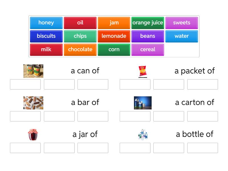 a can of: lemonade, beans, corn, a packet of: chips, biscuits, sweets, a bar of: chocolate, cereal, a carton of: milk, orange juice, a jar of : honey, jam, a bottle of: oil, water,