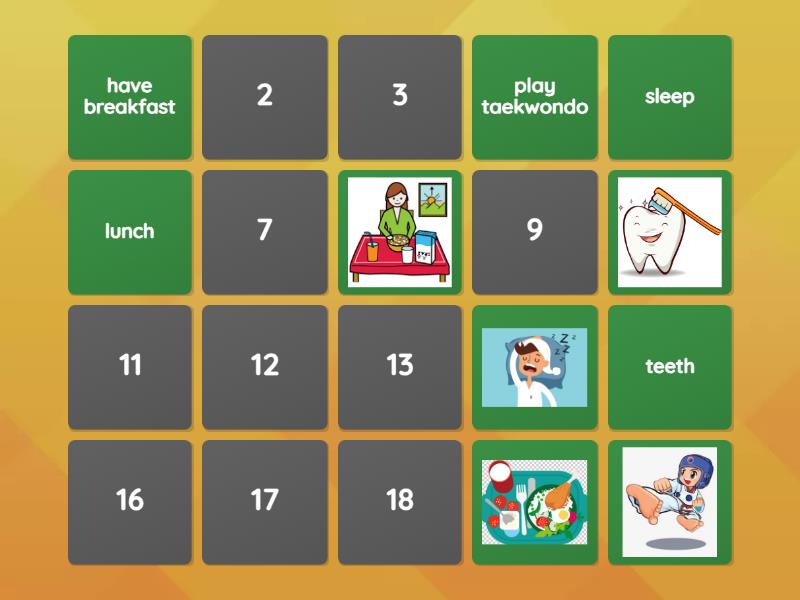 sleep, teeth, lunch, have breakfast, play taekwondo, school, dinner, family, take a shower, brush my teeth,
