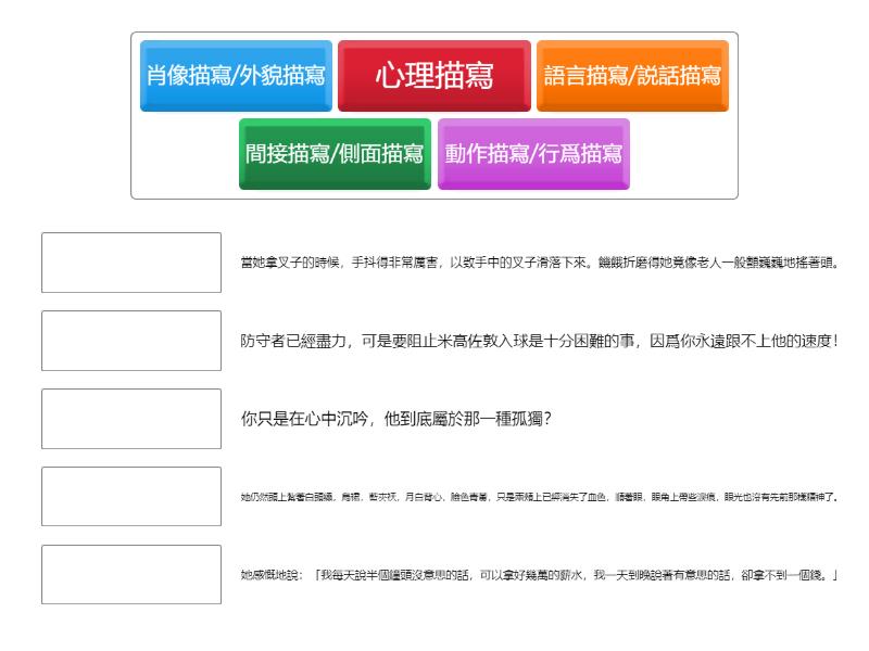 肖像描寫/外貌描寫 - 她仍然頭上紮著白頭繩,烏裙,藍夾祆,月白背心,臉色青黃,只是兩頰上已經消失了血色,順著眼,眼角上帶些淚痕,眼光也沒有先前那樣精神了。, 動作描寫/行爲描寫 - 當她拿叉子的時候,手抖得非常厲害,以致手中的叉子滑落下來。饑餓折磨得她竟像老人一般顫巍巍地搖著頭。, 語言描寫/説話描寫 - 她感慨地說:「我每天說半個鐘頭沒意思的話,可以拿好幾萬的薪水,我一天到晚說著有意思的話,卻拿不到一個錢。」, 心理描寫 - 你只是在心中沉吟,他到底屬於那一種孤獨?, 間接描寫/側面描寫 - 防守者已經盡力,可是要阻止米高佐敦入球是十分困難的事,因爲你永遠跟不上他的速度!,