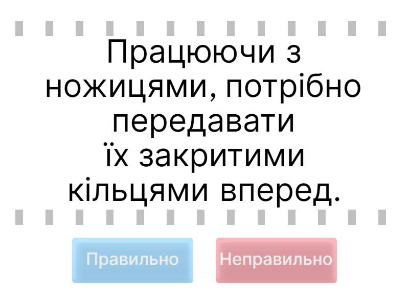Правильно: Працюючи з ножицями, потрібно передавати їх закритими кільцями вперед., Після роботи потрібно прибирати робоче місце., Перед роботою з інструментами потрібно перевірити їх справність., Перед ліпленням потрібно застелити стіл серветкою або дощечкою., Не можна їсти пластилін, бо це небезпечно., Неправильно: Використовувати ножиці можна будь-яким способом., Фарби можна спробувати на смак, Клеєм можна намазати обличчя, Стеком можна гратися, як мечем., Пластилінові фігурки можна складати в підручники.,
