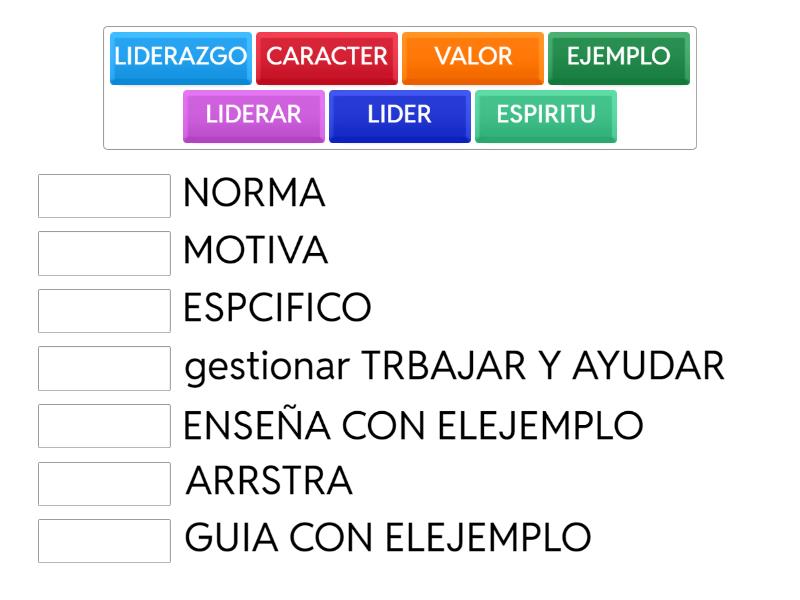 LIDER - ENSEÑA CON ELEJEMPLO , LIDERAZGO - GUIA CON ELEJEMPLO , LIDERAR  - gestionar TRBAJAR Y AYUDAR , EJEMPLO - ARRSTRA, VALOR - NORMA, ESPIRITU - MOTIVA , CARACTER - ESPCIFICO ,