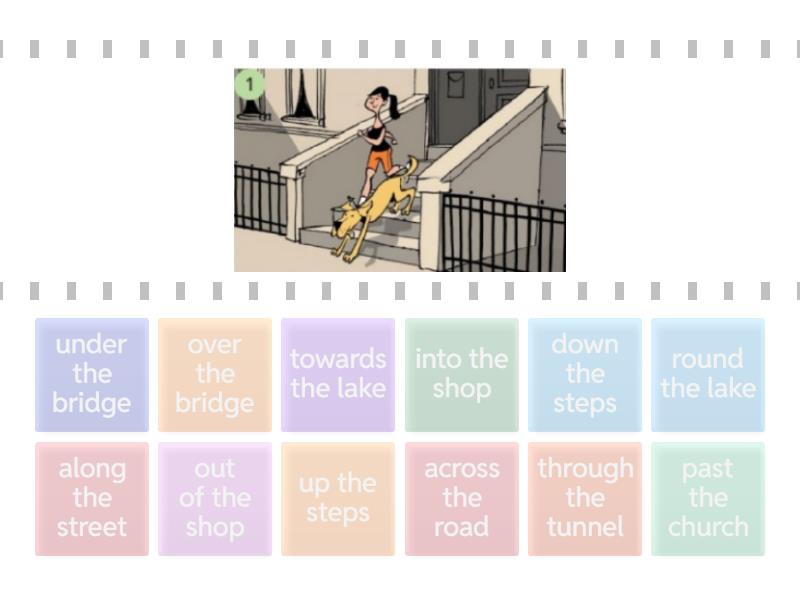 down the steps, across the road, over the bridge, into the shop, out of the shop, under the bridge, past the church, through the tunnel, towards the lake, round the lake, along the street, up the steps,