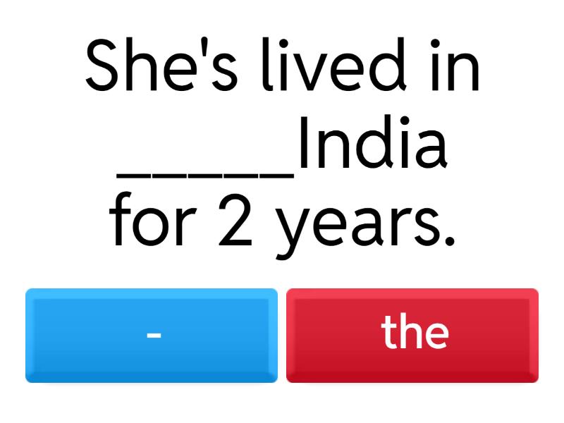 1) She's lived in _____India for 2 years. a) - b) the 2) She lives near ___ Volga. a) - b) the 3) We've always wanted to go to ____ Paris. a) - b) the 4) My friends live in ____ US.  a) - b) the 5) I like spending time in ____ Kiev. a) - b) the 6) They sailed round ____ Lake Baikal. a) - b) the 7) Do you wanna go to ___ South America? a) - b) the 8) She's dreaming about a romantic trip to ___ Europe. a) - b) the 9) Her motherland is __ Netherlands. a) - b) the 10) I've never been to __UK. a) - b) the