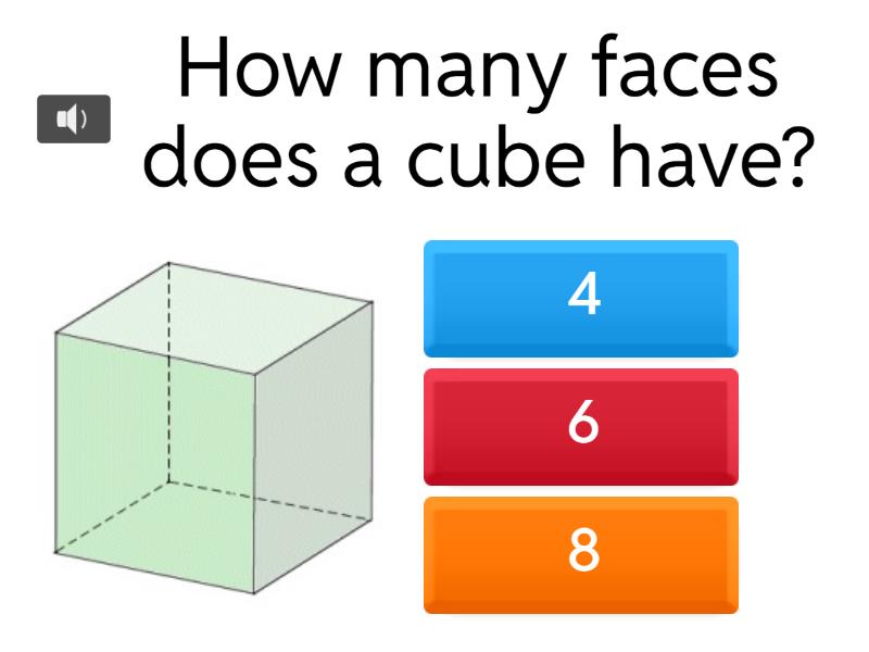 1) How many faces does a cube have? a) 4 b) 6 c) 8 2) How many edges does a cube have? a) 6 b) 8 c) 12 3) How many vertices does a cube have? a) 6 b) 8 c) 12 4) Which 3D shape has no edges, vertices or faces?  a) cone b) cylinder c) sphere 5) Which shape has one vertice, 2 faces and no real edges? a) pyramid b) cylinder c) cone 6) Which shape is made of 5 faces, 5 vertices and 8 edges?  a) cylinder b) rectangular pyramid c) triangular pyramid 7) What is a pyramid? a) 3D shape b) 2D shape c) Flat shape d) Circle 8) How many faces does a triangular prism have? a) 5 b) 4 c) 6 d) 3 9) What is the base shape of a square pyramid? a) Square b) Triangle c) Circle d) Rectangle 10) How many vertices does a rectangular prism have? a) 8 b) 6 c) 10 d) 4 11) Which shape has a single base? a) Pyramid b) Prism c) Sphere d) Cube 12) What is a prism? a) 3D shape b) 2D shape c) Flat shape d) Circle 13) How many edges does a cube have? a) 12 b) 8 c) 6 d) 10 14) What is the base shape of a triangular prism? a) Triangle b) Square c) Circle d) Rectangle 15) How many faces does a cube have? a) 6 b) 4 c) 8 d) 5 16) Which shape has two parallel bases? a) Prism b) Pyramid c) Sphere d) Cone