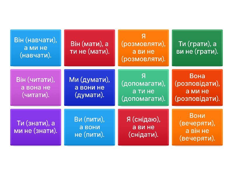 Він (навчати), а ми не (навчати). - Він навчає, а ми не навчаємо., Він (мати), а ти не (мати). - Він має, а ти не маєш., Я (розмовляти), а ви не (розмовляти). - Я розмовляю, а ви не розмовляєте., Ти (грати), а ви не (грати). - Ти граєш, а ви не граєте., Він (читати), а вона не (читати). - Він читає, а вона не читає., Ми (думати), а вони не (думати). - Ми думаємо, а вони не думають., Я (допомагати), а ти не (допомагати). - Я допомагаю, а ти не допомагаєш., Вона (розповідати), а ми не (розповідати). - Вона розповідає, а ми не розповідаємо., Ти (знати), а ми не (знати). - Ти знаєш, а ми не знаємо., Ви (пити), а вони не (пити). - Ви п’єте, а вони не п’ють., Я (снідаю), а ви не (снідати). - Я снідаю, а ви не снідаєте., Вони (вечеряти), а він не (вечеряти). - Вони вечеряють, а він не вечеряє.,