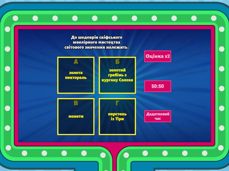 1) До шедеврів скіфського ювелірного мистецтва світового значення належить: a) золота пектораль b) золотий гребінь з кургану Солоха c) монети d) перстень із Тіри 2) до важливих досягнень античності в царині архітектури Греції належить винахід: a) цементу b) куполу c) ордерів d) вітражів 3) Архітектура якого стилю вирізнялася монументальністю, простотою, суворістю (зубчасті мури, вузькі вікна-бійниці на масивних стінах) a) романського b) готичного c) скіфського d) бароко 4) Стиль,що зародився в Італії в XIV ст.; грунтувався на ідеалах гуманізму, та орієнтувався на спадщину античності a) візантійський b) ренесанс c) бароко d) класицизм 5) За правління якого гетьмана було створено найбільше споруд у стилі козацького бароко? a) Іван Мазепа b) Павло Полуботок c) Іван Самойлович d) Богдан Хмельницький 6) Хто з композиторів написав цикл "Пори року"? a) Д. Тартіні b) А. Кореллі c) А. Вівальді d) В. А. Моцарт 7) Стиль, якому властиві прагнення до свободи, до зображення сильних пристрастей a) класицизм b) романтизм c) бароко d) реалізм 8) Який період в історії української культури називають "золотим віком української музики"? a) друга половина XVII ст. b) друга половина XVIII ст. c) XIX ст. d) XVI ст.