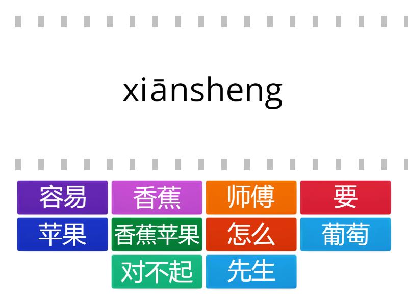 先生  - xiānsheng, 要  - yào, 师傅  - shīfu, 香蕉苹果 - xiāngjiāopíngguǒ, 香蕉 - xiāngjiāo, 苹果 - píngguǒ, 对不起 - duìbuqǐ, 怎么 - zěnme, 容易  - róngyì, 葡萄 - pútao,