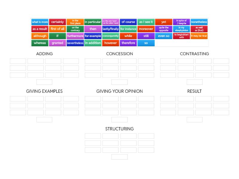 ADDING: moreover, what is more, furthermore, in addition, as well as (that), CONCESSION: it may be true, granted, certainly, if, of course, CONTRASTING: on the one hand … on the other hand, while, although, nonetheless, even so, still, in spite of / despite, on the contrary, yet, nevertheless, however, whereas, quite the opposite, GIVING EXAMPLES: for instance, for example, in particular, GIVING YOUR OPINION: in my view/opinion , as I see it, RESULT: therefore, consequently, as a result, so, STRUCTURING: to begin/start with, in the first place, then, first of all, lastly/finally,