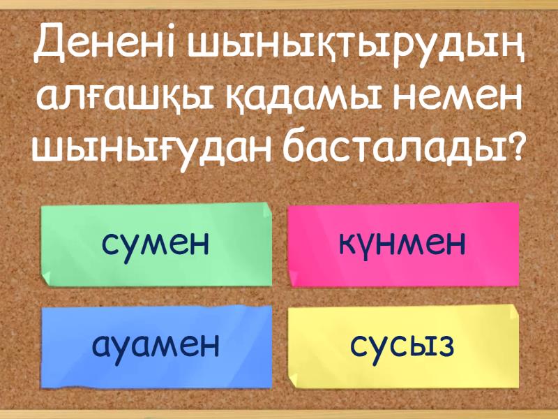1) Денені шынықтырудың алғашқы қадамы немен шынығудан басталады? a) сумен b) күнмен c) ауамен d) сусыз 2) Президенттік сынаманың мақсаты? a) Жарыстарға көбірек қатыстыру мақсатында. b) Салауатты өмір салтын насихаттау, халықты өз дене бітімін жетілдіруге және спортпен жүйелі түрде айналысуға тарту және көпшіліктің денсаулығын нығайту c) Салауатты өмір салтын насихаттау үшін d) Дене қуаты қаситтерін дамыту үшін 3) Бекзат Саттарханов қай олимпиаданың чемпионы? a) Сидней b) Бейжің c) Атланта d) Лондон 4) Мына ойынның қайсысы жылқысыз ойнатылады? a) Аударыспақ b) Теңге ілу c) Асық ату d) Ақсүйек 5) Қысқа қашықтыққа жүгіруде қандай сөре (старт) түрі қолданылады? a) жоғары b) кез келген c) төмен d) орташа 6) Бұл доппен қандай спорт түрі ойналады? a) Боулинг b) Кикбол c) Үстел теннисі d) Крек 7) Серік Сапиев қай олимпиаданың чемпионы? a) Сидней b) Атланта c) Лондон d) Бейжің 8) «Волейбол» сөзбе сөз ағылшын тілінен қалай деп аударылады? a) ұшатын доп b) себет арқылы c) секіретін доп d) құбылмалы доп 9) Волейболда алаңның бір жағында неше ойыншы ойнайды? a) 5 b) 6 c) 10 d) 7 10) Ойын кезінде футболист қай дене мүшесімен допты тоқтата алмайды? a) баспен b) аяқпен c) денемен d) қолмен 11) Жақсылық Үшкемпіров спорттың қай түрімен айналысқан? a) грек-рим күресі b) еркін күрес c) бокс d) дзюдо 12) Қай ойын түрінде екі командада 5 ойыншыдан болады? a) футбол b) хоккей c) волейбол d) баскетбол 13) Асықтың ең үлкен түрі қалай аталады a) Топай b) Кентай c) Сақа d) Асық 14) «Спорт патшасы» қай спорт түрі болып саналады? a) Футбол b) Волейбол c) Баскетбол d) Теннис 15) Бұл доппен қандай спорт түрі ойналады? a) Ракетбол b) Стикбол c) TagPro d) Теннис