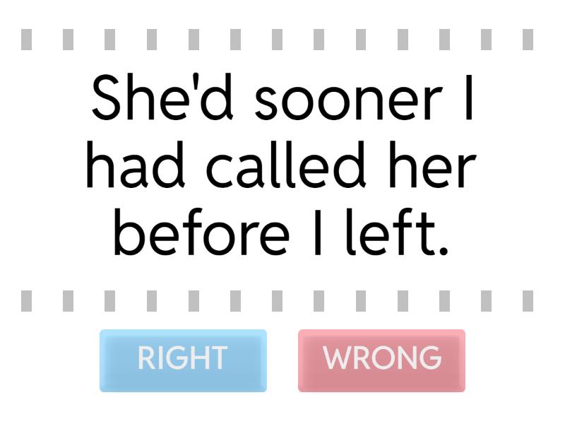 RIGHT: She'd sooner I had called her before I left., I would rather have tea than a coffee., Would you rather we go by car or train?, He'd rather you didn't say anything to her., WRONG: I'd rather to go to the cinema than stay at home., Would you rather we will order pizza or pasta?, They'd rather he is here now., We'd sooner she was to come with us., She would sooner I am picking her up after lunch., I would rather were you here.,