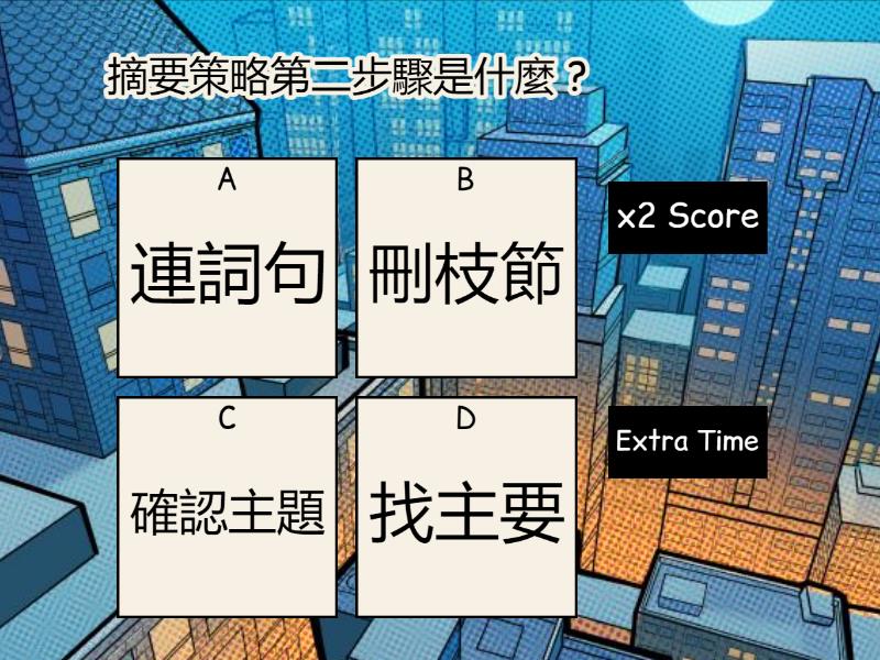 1) 刪除策略第一步驟是什麼 ? a) 連詞句 b) 找主要 c) 刪除全部 d) 刪除重複 2) 摘要策略第二步驟是什麼 ? a) 確認主題 b) 刪枝節 c) 連詞句 d) 找主要 3) 摘要策略第三步驟 a) 連詞句 b) 刪除重複 c) 找主要 d) 刪除無關 4) 第一步驟找主要中有三個基本句型請問"不包含"什麼? a) 誰+是什麼 b) 誰+怎麼樣 c) 誰+做什麼 d) 誰+在哪裡 5) 第二步驟刪枝節中有三個刪除,請問"不包含"什麼? a) 刪除細節 b) 刪除重複 c) 刪除不重要 d) 刪除主要人物 6) 第三步驟連詞句中把剩餘詞語連接成通順的句子後,最後還需要做什麼動作? a) 直接跳過 b) 讀一讀,也請別人聽聽看 c) 自己讀就好 d) 用看的就好
