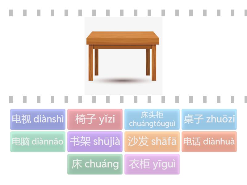 桌子 zhuōzi, 椅子 yǐzi, 沙发 shāfā, 床 chuáng, 衣柜 yīguì, 电视 diànshì, 电脑 diànnǎo, 电话 diànhuà, 书架 shūjià, 床头柜 chuángtóuguì,