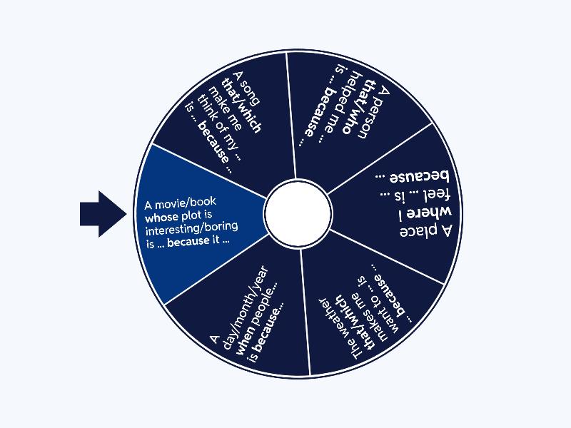 1) A song that/which make me think of my ... is ... because ... 2) A person that/who helped me ... is ... because ... 3) A place where I feel ... is ... because ... 4) The weather that/which makes me want to ... is ... because ... 5) A day/month/year when people... is because... 6) A movie/book whose plot is interesting/boring is ... because it ...