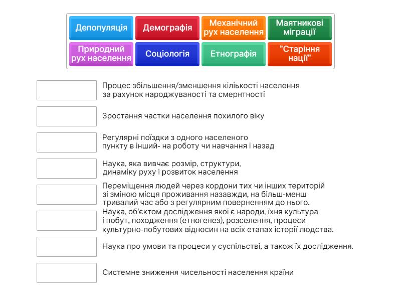 Демографія - Наука, яка вивчає розмір, структури, динаміку руху і розвиток населення, Етнографія - Наука, об'єктом дослідження якої є народи, їхня культура і побут, походження (етногенез), розселення, процеси культурно-побутових відносин на всіх етапах історії людства., Соціологія - Наука про умови та процеси у суспільстві, а також їх дослідження., Депопуляція - Системне зниження чисельності населення країни, Природний рух населення - Процес збільшення/зменшення кіліькості населення за рахунок народжуваності та смернтності, Механічний рух населення - Переміщення людей через кордони тих чи інших територій зі зміною місця проживання назавжди, на більш-менш тривалий час або з регулярним поверненням до нього., Маятникові міграції - Регулярні поїздки з одного населеного пункту в інший- на роботу чи навчання і назад, "Старіння нації" - Зростання частки населення похилого віку,