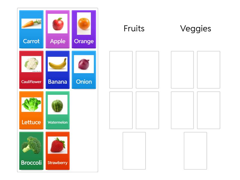 Fruits: Apple, Banana, Orange, Strawberry, Watermelon, Veggies: Lettuce, Broccoli, Onion, Cauliflower, Carrot,