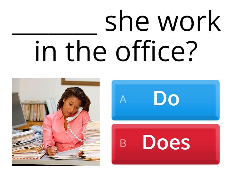 1) _______  she work in the office?  a) Do b) Does 2) _______ you play tennis? a) Do b) Does 3) _______ _______ David live? a) Does where b) Where do c) Where does d) Do where 4) What _______ you want to eat? a) Do b) Does 5) _______ she eat fruits?  a) Do b) Does 6) _______ the cats play together?   a) Do b) Does 7) _______ _______ Dan and Ran live in London? a) Why do b) Why does c) Do why d) Does why 8) _______ she go to the mall?  a) Do b) Does 9) _______ the dog bark a lot? a) Do b) Does 10) _______ they listen to the radio? a) Do b) Does