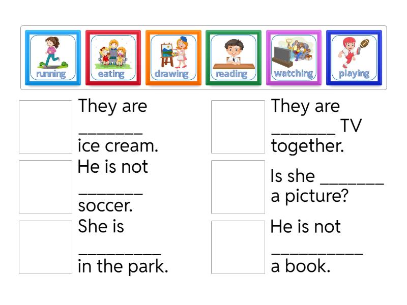 She is _________ in the park., He is not __________ a book., They are _______ ice cream., Is she _______ a picture?, They are _______ TV together., He is not _______ soccer.,