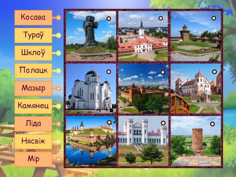 Камянец, Лiда, Полацк, Мiр, Нясвiж, Мазыр, Тураў, Косава, Шклоў.