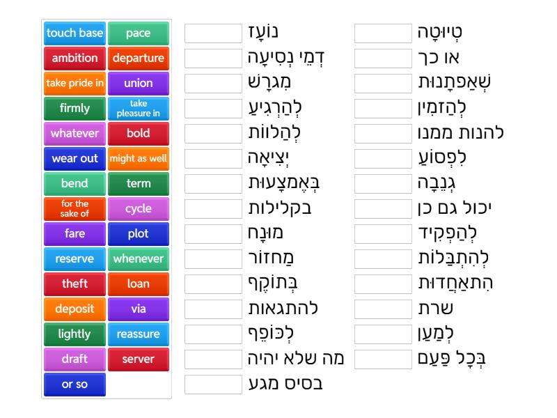 for the sake of - לְמַעַן, might as well - יכול גם כן, or so - או כך, take pleasure in - להנות ממנו, take pride in - להתגאות, touch base - בסיס מגע, wear out - לְהִתְבַּלוֹת, whatever - מה שלא יהיה, firmly - בְּתוֹקֶף, lightly - בקלילות, via - בְּאֶמצָעוּת, whenever - בְּכָל פַּעַם, bold - נוֹעָז, departure - יְצִיאָה, theft - גְנֵבָה, reserve - לְהַזמִין, reassure - לְהַרְגִיעַ, draft - טְיוּטָה, cycle - מַחזוֹר, fare - דְמֵי נְסִיעָה, loan - לְהַלווֹת, plot - מִגרָשׁ, term - מוּנָח, ambition - שְׁאַפתָנוּת, bend - לְכּוֹפֵף, server - שרת, union - הִתאַחֲדוּת, pace - לִפְסוֹעַ, deposit - לְהַפְקִיד,