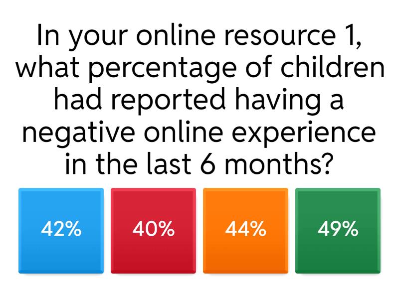 1) In your online resource 1, what percentage of children had reported having a negative online experience in the last 6 months? a) 42% b) 40% c) 44% d) 49% 2) If you're experiencing bullying online, who should you tell? a) Trusted adult b) You shouldn't tell anyone. It's better off if I keep it to myself. 3) What health and wellbeing dimensions are affected due to cyberbullying? a) Emotionally b) Mentally c) Physically d) Social e) All of the above 4) What is not a form of cyberbullying? a) Constant, ongoing online bullying b) A once off comment, that never happens again c) Shaming someone online d) Sharing embarrassing online videos/images 5) Resource 1 states what percentage of children received threat or online abuse? a) 19% b) 18% c) 15% d) 13% 6) Is depression and anxiety a symptom of cyberbullying? a) Yes b) No