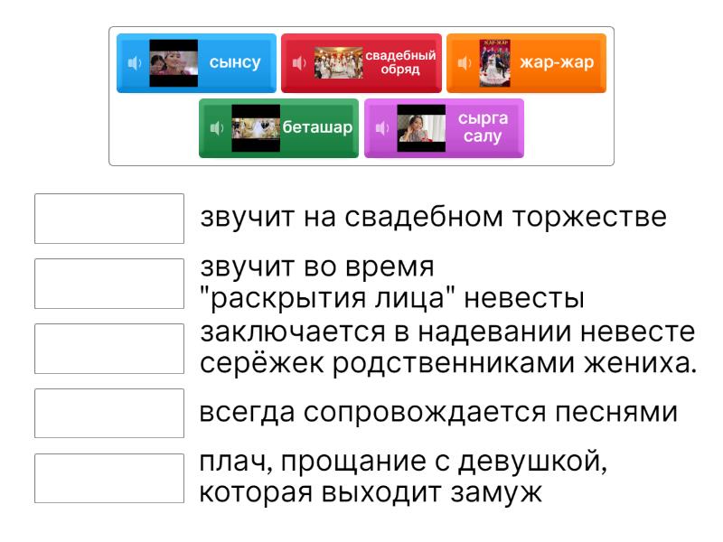 свадебный обряд - всегда сопровождается песнями, сынсу - плач, прощание с девушкой, которая выходит замуж, жар-жар - звучит на свадебном торжестве, беташар  - звучит во время "раскрытия лица" невесты, сырга салу - заключается в надевании невесте серёжек родственниками жениха.,