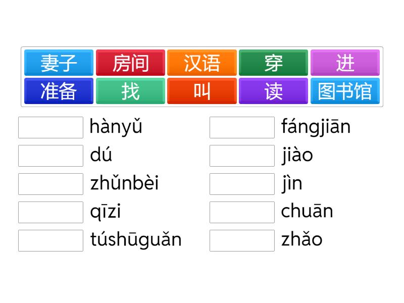 妻子 - qīzi, 房间 - fángjiān, 找 - zhǎo, 读 - dú, 准备 - zhǔnbèi, 穿 - chuān, 进 - jìn, 叫 - jiào, 图书馆 - túshūguǎn, 汉语 - hànyǔ,