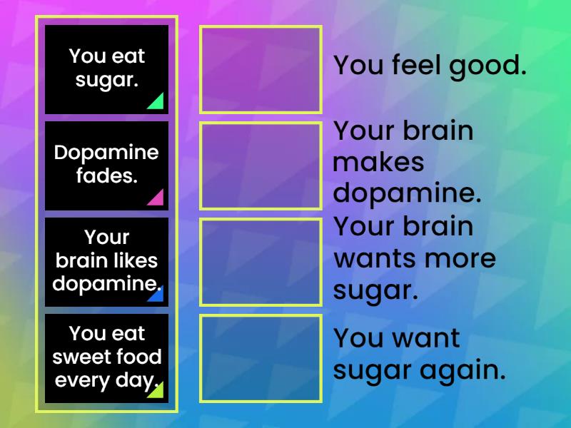 You eat sugar. - Your brain makes dopamine., Dopamine fades. - You want sugar again., Your brain likes dopamine. - You feel good., You eat sweet food every day. - Your brain wants more sugar.,