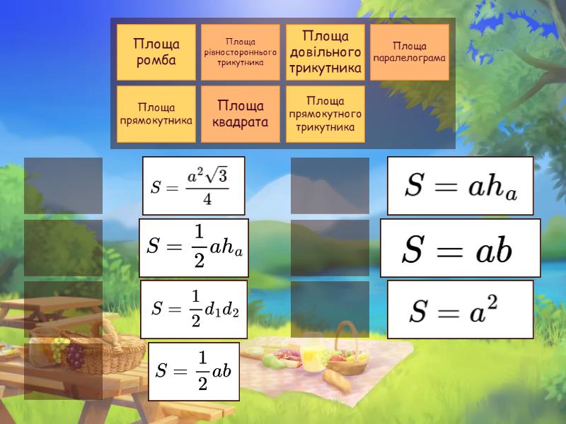 Площа паралелограма, Площа квадрата, Площа прямокутника, Площа довільного трикутника, Площа рівностороннього трикутника, Площа прямокутного трикутника, Площа ромба ,