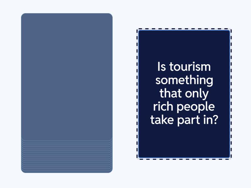 What images spring to mind when you hear the word ‘tourism’?, How important is tourism to your country?, Would you like to work in tourism?, What are the good and bad things about tourism?, What do you think tourism will be like in the future?, What are the major tourist attractions in your country?, What do you think of the idea of space tourism?, How does tourism change lives?, What is eco-tourism? Do you think it’s a good idea?, Is there a difference between a tourist and a backpacker ?, Do you think tourism helps people in the world understand each other?, Is tourism something that only rich people take part in?, What factors affect tourism?, Do tourists really get to see the real countries they visit?, Do you think tourism is bad for the planet?, Are tourists in your country funny?, How has tourism changed over the past few decades?, Are you a good ambassador for your country’s tourism industry?.