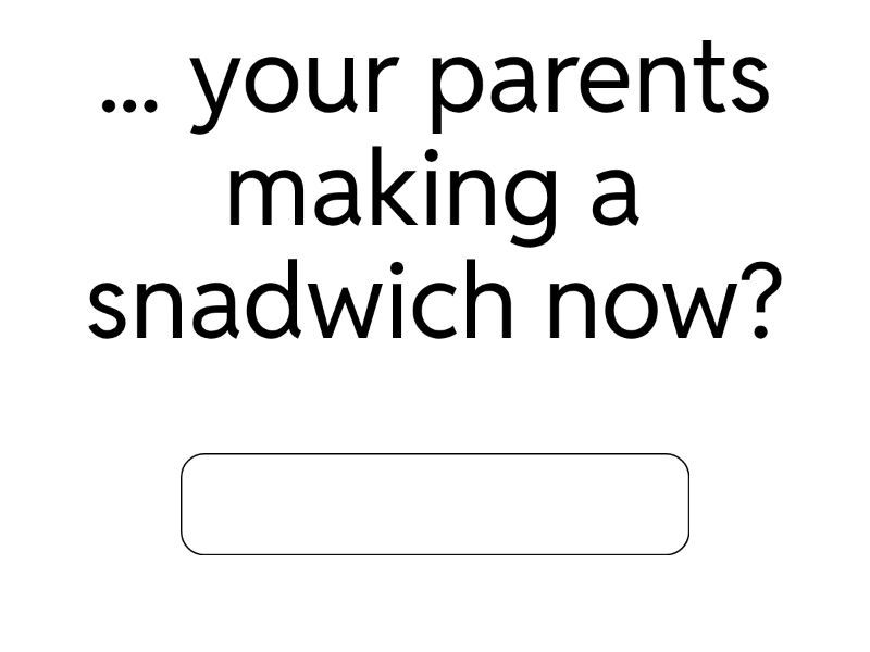 ... your parents making a snadwich now?, ... Fred going to the cinema now?, ... they watching a horror film?, ... that girl eating ice cream?, ... they ... in the park?, ... Tom and Ben ... breakfast in the kitcen?, ... I ... the cats today?, Is your mother listening to music? Yes, ... ... ., Are our gradparents travelling to Japan? No, ... ... ., Is your dog sleeping on the sofa? No, ... ... ., Are you playing basketball? Yes, ... ... ., Are you and Liza reading a crime story now? No, ... ... ., Where ... I sleeping?, Who ... you talking to?, What time ... she going to bed today?, Why ... your teachers laughing?, What ... happening in thes room?, What are they ... this week?, Is he ... a red T-shirt today?, Is it ... ?, What are you ... about right now?, ... are you going to the shop? On Monday., ... are you going? I'm going home., ... is Mary doing her homework? At school., ... are Greg and you doing tomorrow? We are visiting our friends..