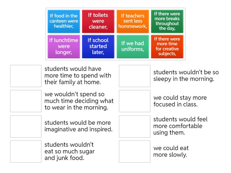 If there were more time for creative subjects, - students would be more imaginative and inspired., If toilets were cleaner, - students would feel more comfortable using them., If lunchtime were longer, - we could eat more slowly., If there were more breaks throughout the day, - we could stay more focused in class., If we had uniforms, - we wouldn’t spend so much time deciding what to wear in the morning., If food in the canteen were healthier, - students wouldn't eat so much sugar and junk food., If teachers sent less hommework, - students would have more time to spend with their family at home., If school started later, - students wouldn't be so sleepy in the morning.,