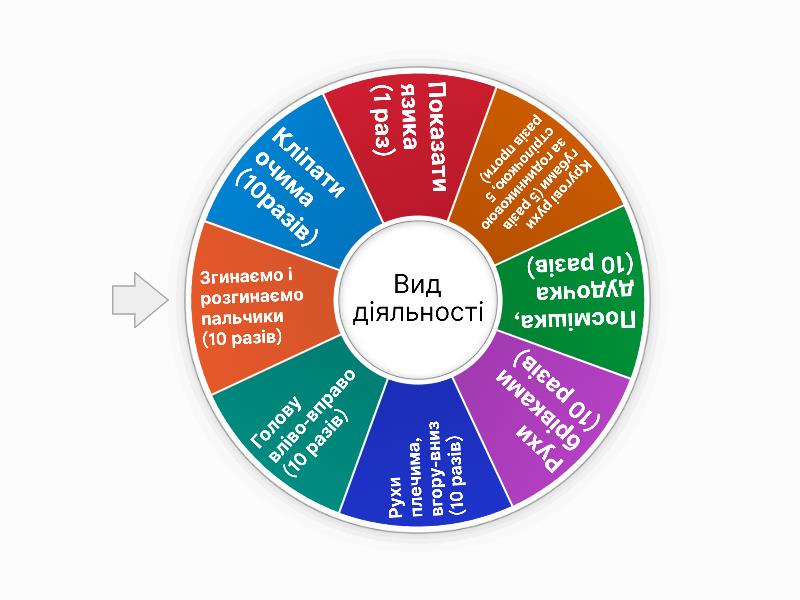 Кліпати очима (10разів), Показати язика (1 раз), Кругові рухи губами (5 разів за годинниковою стрілочкою, 5 разів проти), Посмішка, дудочка (10 разів), Рухи брівками (10 разів), Рухи плечима, вгору-вниз (10 разів), Голову вліво-вправо (10 разів), Згинаємо і розгинаємо пальчики (10 разів).