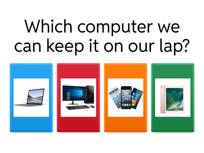 1) Which computer we can keep it on our lap? a) b) c) d) 2) Which computer we cannot carry everywhere? a) b) c) d) 3) Which computer screen we can touch and play games ? a) b) c) d) 4) Which computer your parents use to send messages? a) b) c) d)