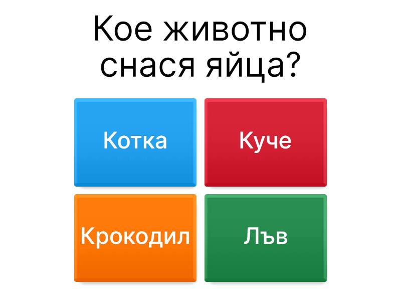 1) Кое животно снася яйца? a) Котка b) Куче c) Крокодил d) Лъв 2) Кое човешко сетиво използваме, за да усещаме миризми? a) Уши b) Уста c) Очи d) Нос 3) През кой сезон дърветата губят листата си? a) Пролет b) Лято c) Есен d) Зима 4) Коя част от човешкото тяло изпомпва кръвта? a) Бели дробове b) Сърце c) Бъбреци d) Черва 5) Кое от изброените е жив организъм? a) Камък b) Стол c) Риба d) Вода