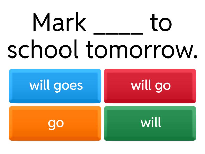 1) Mark ____ to school tomorrow. a) will goes b) will go c) go d) will 2) I will eat strawberry cake ____. a) yesterday b) every week c) this morning d) tomorrow 3) ____ you celebrate my birthday with me next Friday? a) Will b) Are c) Is d) Do 4) Mike ____ a book next week. a) won't reads b) am not reading c) don't read d) will read 5) Harry ____ on his project next weekend. a) works b) work c) won't work d) aren't working 6) Helen will ____ her face before her breakfast. a) to wash b) washing c) washes d) wash 7) ____ you take my picture? a) Will b) Were c) Are d) Does 8) My mother ____ if I forget her birthday. a) is be happy b) will bes happy c) does be happy d) won't be happy 9) When __ you finish your homework? a) will b) do c) does d) won't 10) What ____ she ____ tomorrow?  a) does... will b) will ... do c) do ... will d) was... do