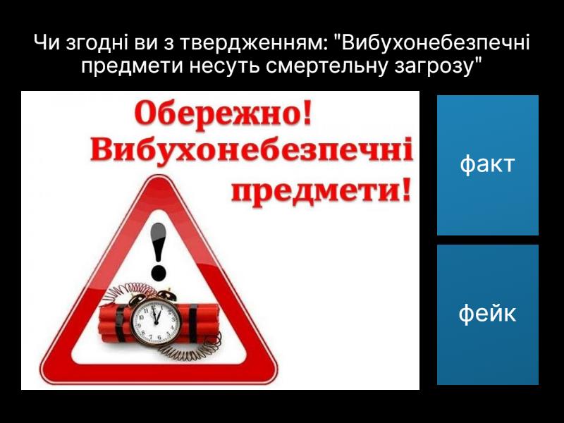 1) Чи згодні ви з твердженням: "Вибухонебезпечні предмети несуть смертельну загрозу" a) факт b) фейк 2) Чи згодні ви з твердженням: "У місті абсолютно безпечно перебувати, мінна небезпека не загрожує городянам" a) факт b) фейк 3) Замінувати можна будь-який предмет: мобільний телефон, пральну машину, піаніно, дитячу іграшку тощо a) факт b) фейк 4) Снаряди, які не розірвалися не становлять загрози, до них можна підходити та, навіть, чіпати їх. a) фейк b) факт 5) Перше правило мінної безпеки: a) підійди ближче, розглянь уважно, сфотографуйрозглянь b) не підходь c) візьми та перенеси якнайдалі d) не чіпай e)  Бути уважним! 6) Міни мають не дуже довгий термін зберігання і через кілька років лежання у землі ржавіють та виходять з ладу. a) факт b) фейк 7) Поряд з підозрілими та вибуховими пристроями слід користуватися засобами радіозв'язку, мобільними телефонами. a) фейк b) факт 8) Якщо побачили на вулиці покинуту сумку, іграшку або телефон - негайно забирайте собі. a) факт b) фейк 9) Це протипіхотна осколкова міна направленої дії.  a) фейк b) факт c) не знаю 10) Це міна-"квіточка"? a) Факт b) Фейк 11) Це граната? a) Фейк b) Факт. 12) Як маркують небезпечні території? a) b) c)