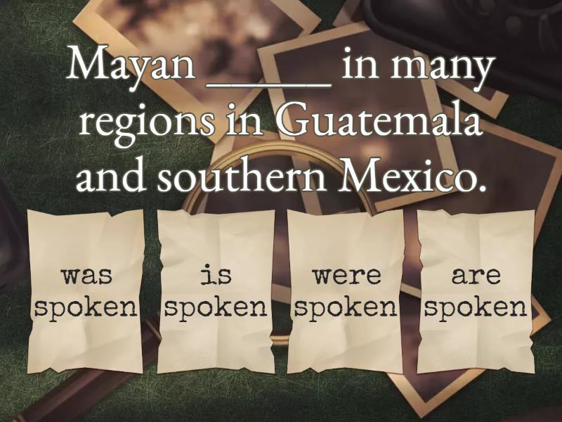 1) Mayan _____ in many regions in Guatemala and southern Mexico. a) was spoken b) is spoken c) were spoken d) are spoken 2) The match _____ by 4.1 million people. a) was watched b) is watched c) were watched d) are watched 3) Manchego cheese _____ in La Mancha, Spain. a) was produced b) is produced c) were produced d) are produced 4) The authorities _____ them about the incident. a) was informed b) is informed c) informed d) are informed 5) Who _____ this novel? a) was written b) is written c) wrote d) written 6) A lot of celebrities _____ to the party. a) was invited b) is invited c) were invited d) are invited 7) It's important that residents _____ the water for three minutes before drinking it. a) were boiled b) are boiled c) boiled d) boil 8) A rare species of insect _____ in the Amazon Rain Forest last year. a) was discovered b) is discovered c) were discovered d) are discovered 9) More than 1,500 passengers died when the Titanic _____. a) is sunk b) was sunk c) sank d) sunk 10) Alcohol _____ to minors or to people who are intoxicated. a) wasn't sold b) isn't sold c) weren't sold d) aren't sold