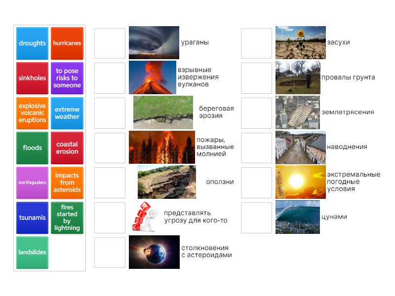 to pose risks to someone - представлять угрозу для кого-то, earthquakes - землетрясения, tsunamis - цунами, hurricanes - ураганы, floods - наводнения, droughts - засухи, landslides - оползни, explosive volcanic eruptions - взрывные извержения вулканов, extreme weather - экстремальные погодные условия, fires started by lightning - пожары, вызванные молнией, sinkholes - провалы грунта, coastal erosion - береговая эрозия, impacts from asteroids - столкновения с астероидами,
