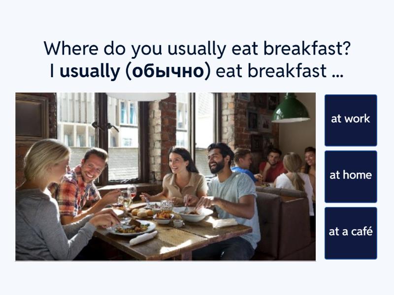 1) Where do you usually eat breakfast? I usually (обычно) eat breakfast ... a) at work b) at home c) at a café  2) In the morning I have... a) breakfast b) dinner c) lunch 3) In the afternoon I have... a) breakfast b) dinner c) lunch 4) Where do you usually eat breakfast? I usually (обычно) eat breakfast ... a) at work b) at home c) at a café  5) In the evening I have... a) breakfast b) dinner c) lunch 6) What is NOT in the picture? a) vegetables  b) pasta c) cheese d) wine 7) Boss: It's 9:30! Where are you?! Ben:____________________________ a) Sorry, I'm lost! b) Sorry, I'm late! c) Sorry, I'm latte! 8) What is NOT in the lunchbox? a) yoghurt / yogurt b) salad c) sandwich d) vegetables 9) What is NOT in the picture? a) orange juice b) meat c) eggs d) yoghurt / yogurt 10) What's this? a) chicken and potatoes  b) fish and chips c) chicken and chips d) fish and potato free 11) I wake up (просыпаюсь) at 4:30 in the morning! a) Wow...that's late! b) Wow...that's early! c) Wow...that's good! 12) Where do you usually eat breakfast? I usually (обычно) eat breakfast ... a) at work b) at home c) at a café