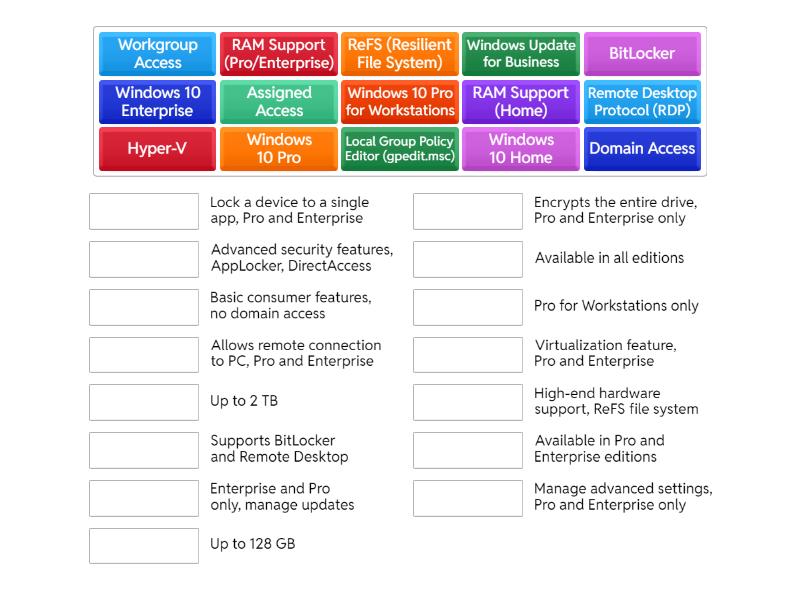 Windows 10 Home - Basic consumer features, no domain access, Windows 10 Pro - Supports BitLocker and Remote Desktop, Windows 10 Enterprise - Advanced security features, AppLocker, DirectAccess, Windows 10 Pro for Workstations - High-end hardware support, ReFS file system, Domain Access - Available in Pro and Enterprise editions, Workgroup Access - Available in all editions, BitLocker - Encrypts the entire drive, Pro and Enterprise only, Remote Desktop Protocol (RDP) - Allows remote connection to PC, Pro and Enterprise, Local Group Policy Editor (gpedit.msc) - Manage advanced settings, Pro and Enterprise only, RAM Support (Home) - Up to 128 GB, RAM Support (Pro/Enterprise) - Up to 2 TB, ReFS (Resilient File System) - Pro for Workstations only, Windows Update for Business - Enterprise and Pro only, manage updates, Assigned Access - Lock a device to a single app, Pro and Enterprise, Hyper-V - Virtualization feature, Pro and Enterprise,