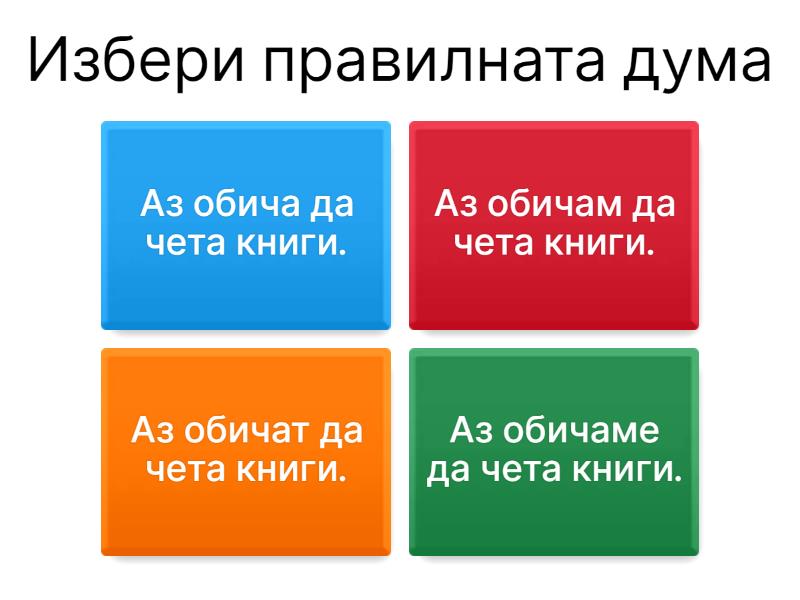 1) Избери правилната дyма a) Аз обича да чета книги. b) Аз обичам да чета книги. c) Аз обичат да чета книги. d) Аз обичаме да чета книги. 2) Кое от изброените е изменяема част на речта? a) Съществително име b) Съюз c) Прилагателно име d) Глагол 3) Кой е синоним на дyмата смел? a) страхлив b) бавен c) храбър d) весел 4) Кой е антонимът на дyмата тъжен? a) весел b) мил c) шyмен d) тих 5) Открийте корена в дyмата планинарски a) план b) планин c) нар d) планинар